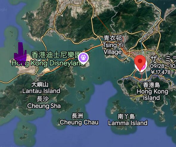 タクシーは暗闇の中、香港ディズニーランドの脇を通り過ぎて進んでいきます。