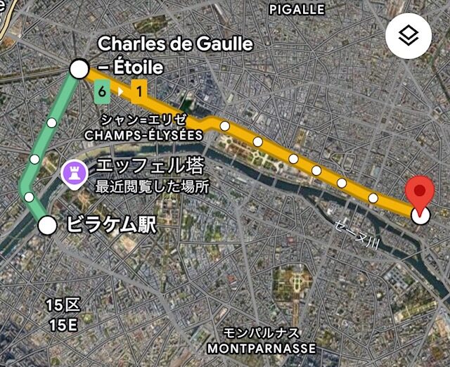 ビラケム駅でメトロ6号線に乗り、シャルルドゴール・エトワール駅で1号線に乗り換えると、ホテルに帰れます。