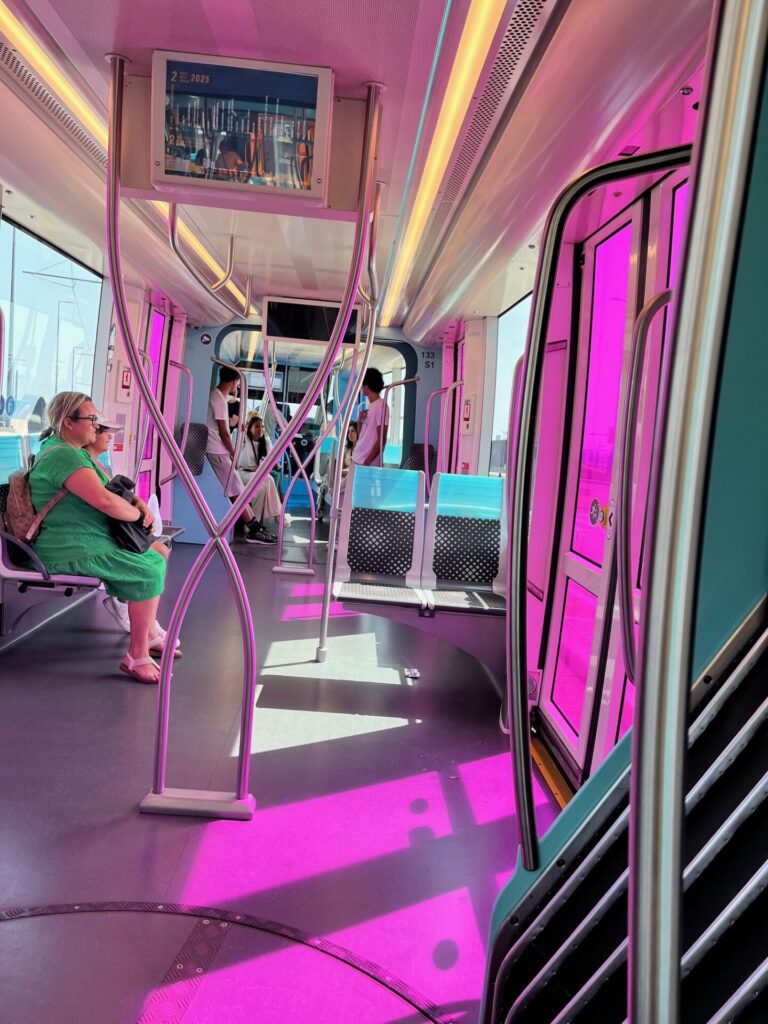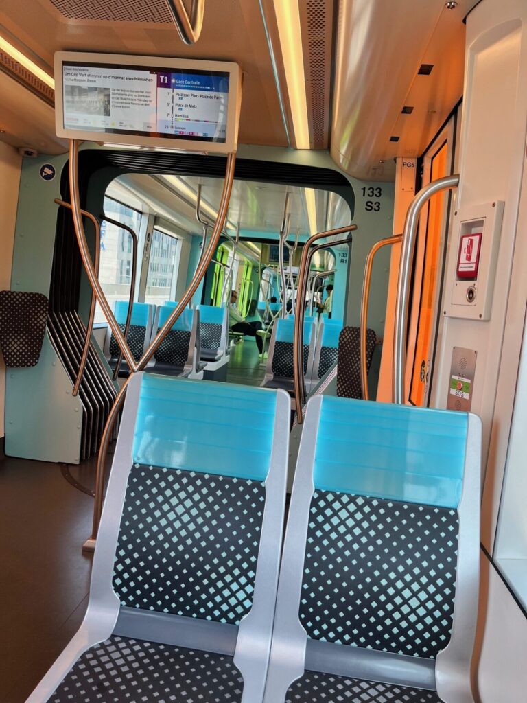 ルクセンブルグのトラムは、効果や背景は分かりませんが、どうやらカラフルな車内を演出しているようです。