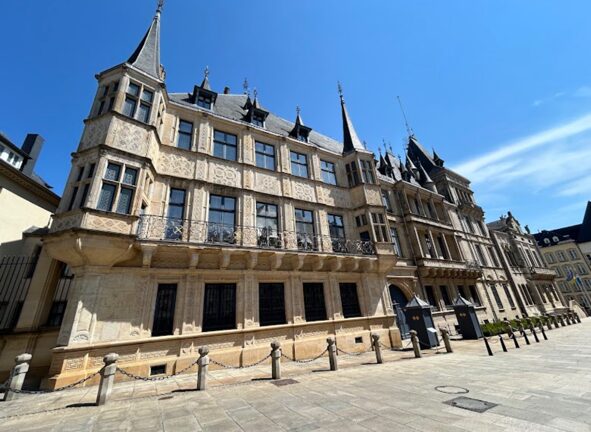 切りそろえられた石畳の舗道(ほどう)を歩いていくと、左側に「ルクセンブルグ大公宮」らしい建物が見えてきました。