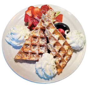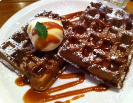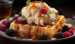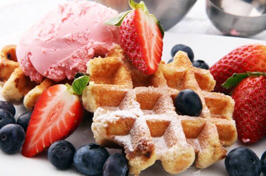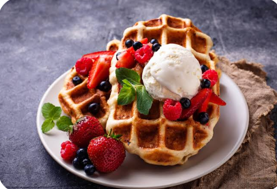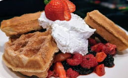 現在では、写真のようにベリーやチョコレート、生クリーム、アイスクリームなどと合わせながら、様々なワッフルが作られ食べられているようです。
