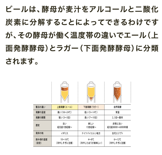上の表からは、ラガーとエールは、使う酵母が違うので発酵の温度と期間が決定的に違うことが分かりますね。