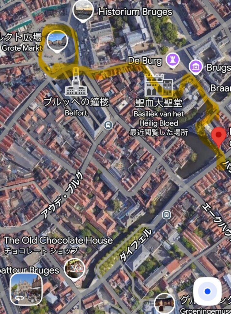 マルクト広場から「聖血大聖堂」を通りながら、運河クルーズの乗り場(赤いシェイプ)に向かおうと思います。
