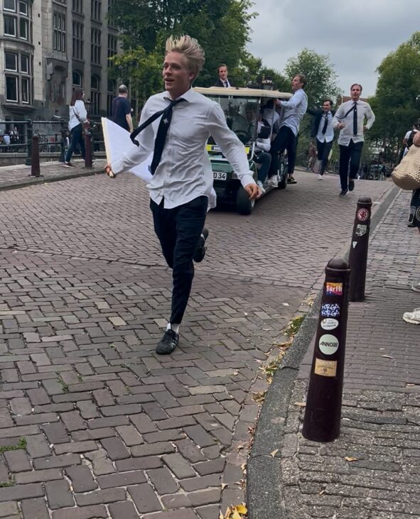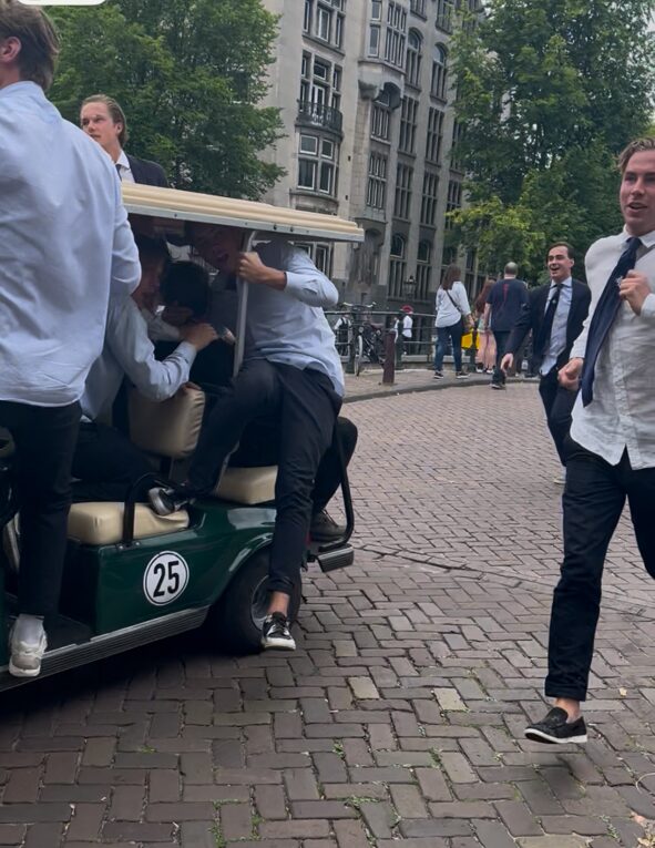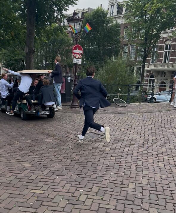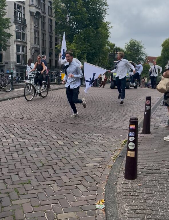 彼らのゴール地点の近くには、運河を眺めながら会食できる路上のテーブルがたくさん出されています。