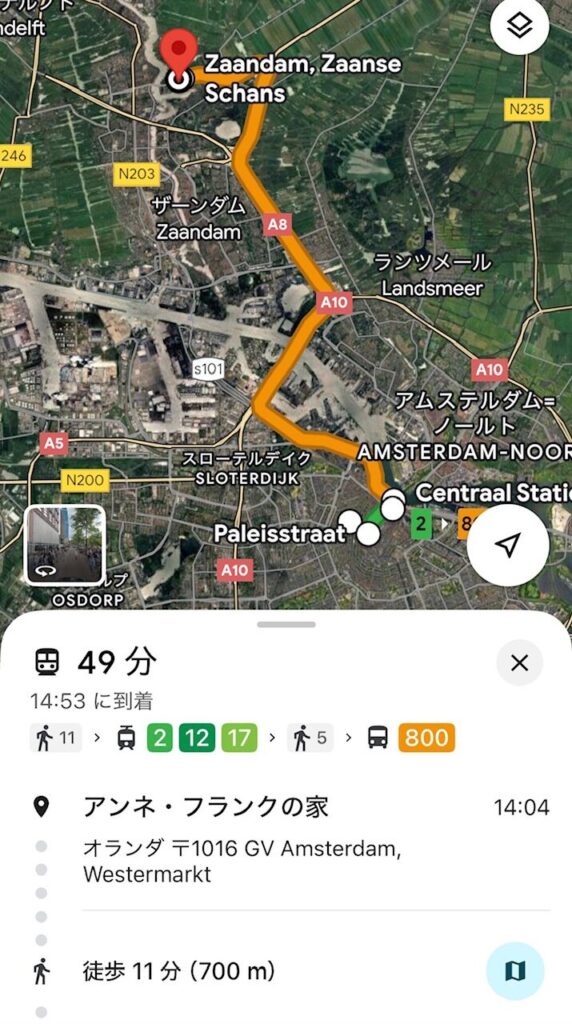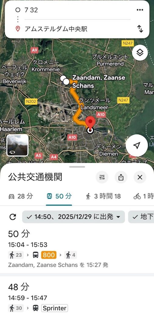 これから、道草を食わず、ひたすら「風車村(ザーンセ・スカンス)」を目指せば、14時53分には着けるようです。