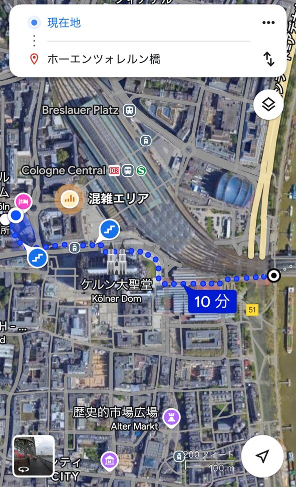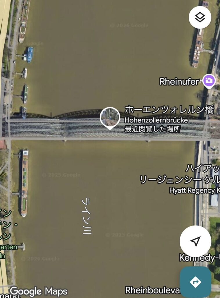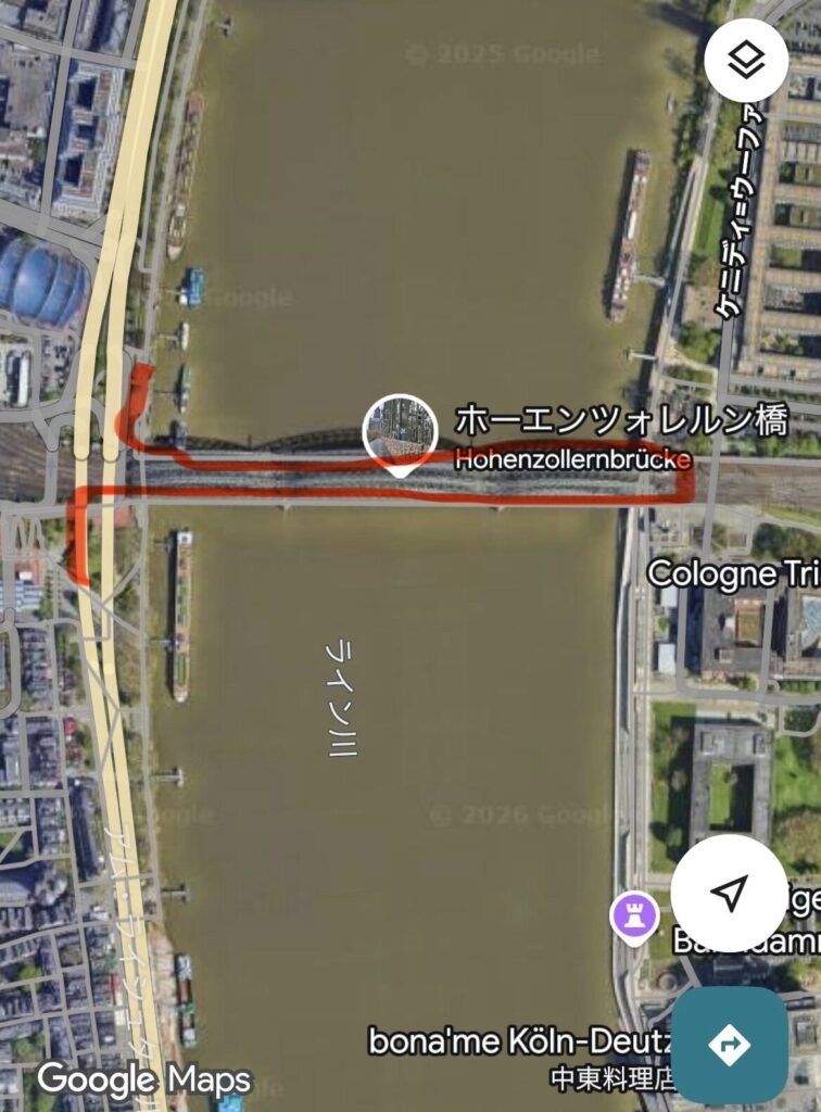 「ホーエンツォレルン橋」をグーグルマップで見ると、鉄道も歩道も上下合計4本通っている物凄く重要な橋のようです。