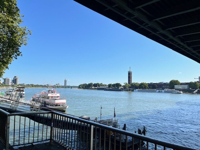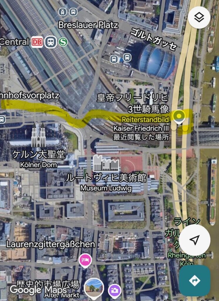 中央駅から出たあと、ケルン大聖堂を右手に見ながら鉄道の脇を通っていくと、ライン川に出られそうです。
