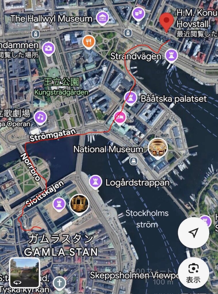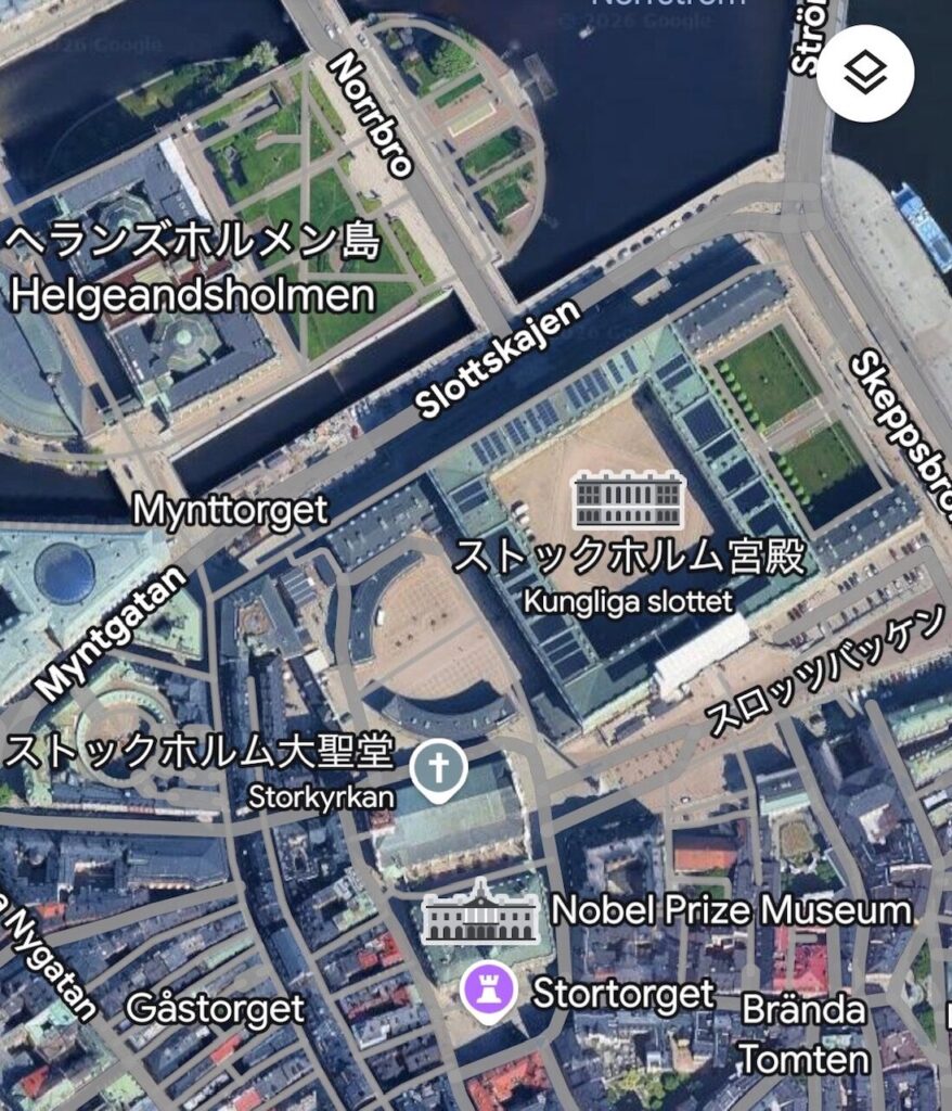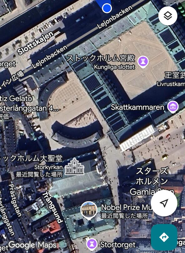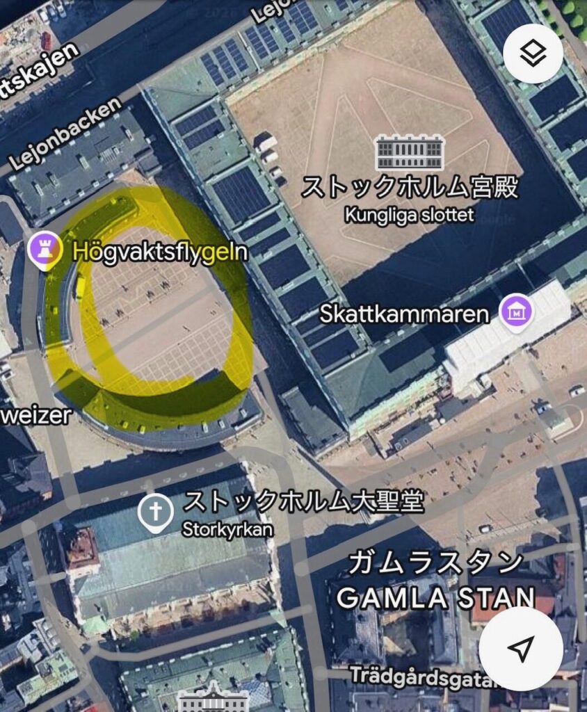 地図では「ストックホルム宮殿」となっていますが、「地球の歩き方」等の書籍に準じて「王宮」という表現を使うことにしました。