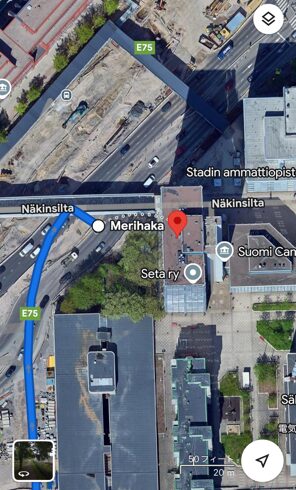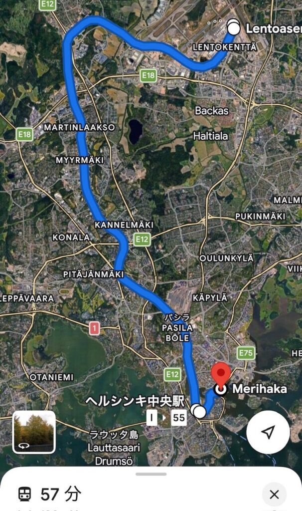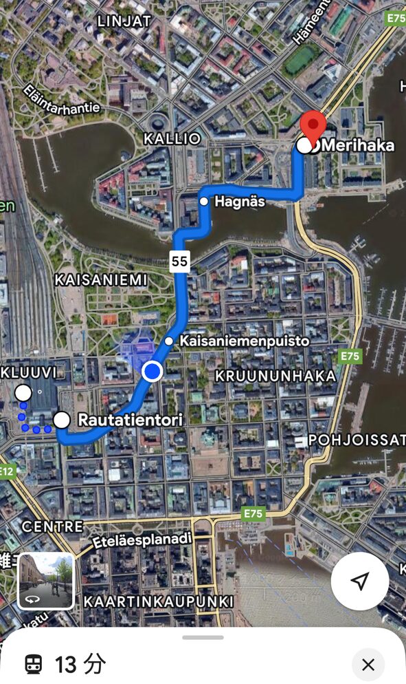 55番バスに乗り、3つめのバス停「Merihaka」で降ります。