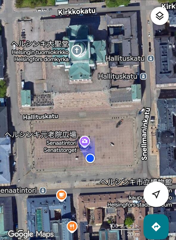 平面地図だと、高低は分かりませんが、ヘルシンキ大聖堂と元老院広場の間に階段があり、大聖堂がかなり高くなっています。