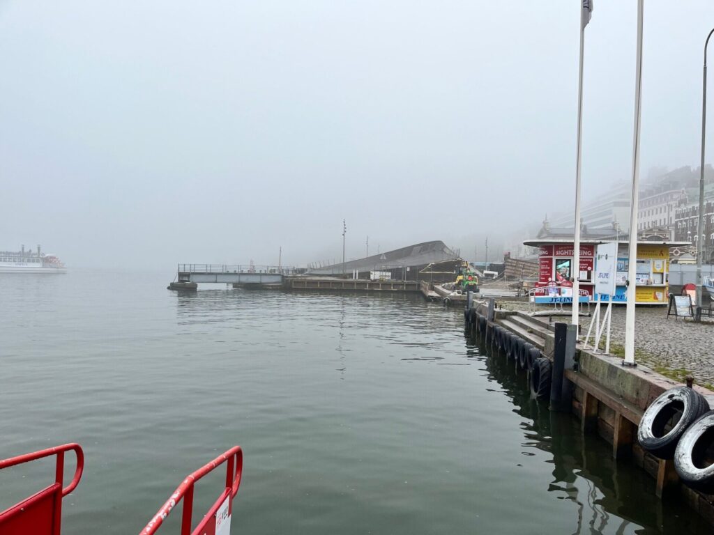 視界が悪いせいか、航行を見合わせているフェリーが埠頭に集まっています。