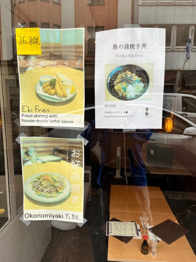 魚の蒲焼丼は15€(約2500円)、お好み焼きは15.9€(約2740円)です。