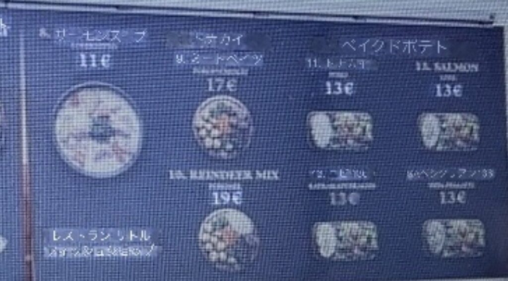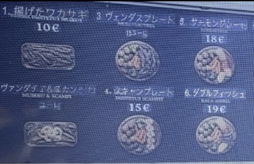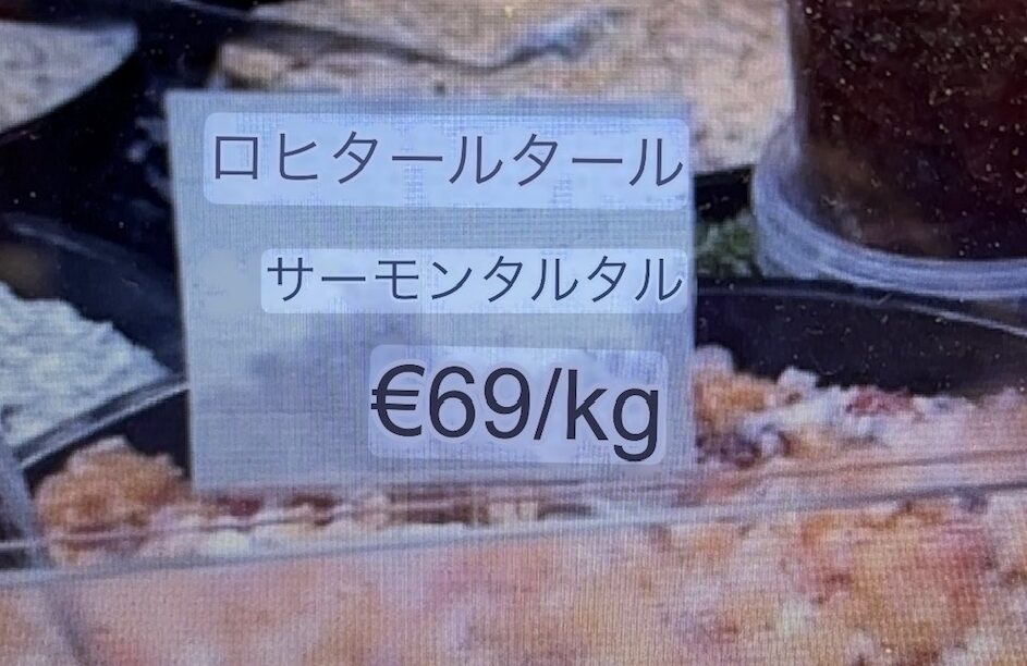 左(サーモン)は1kg69€(約11900円)、右(エビ)は79€(約13600円)です。